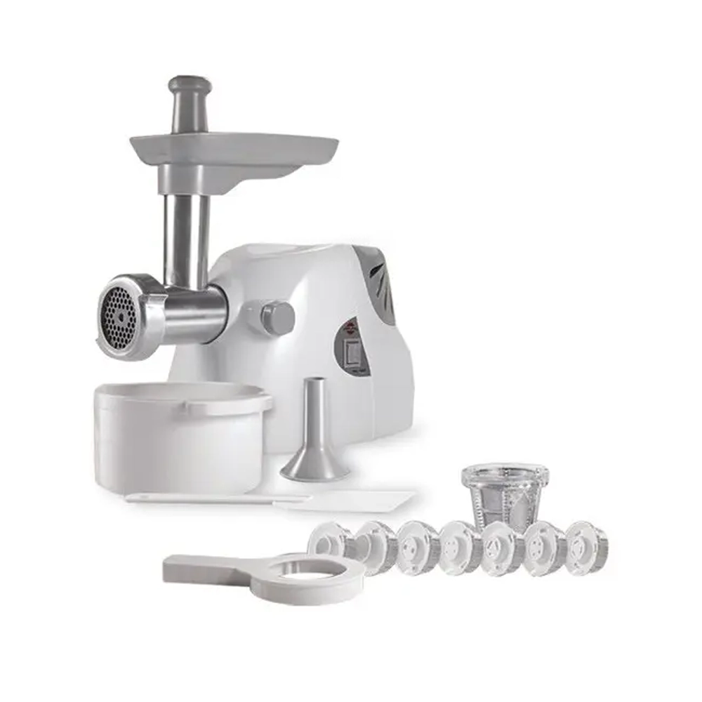 دفترچه راهنما ,دو عدد شبکه مخصوص گوشت چرخ کرده، قیمه و سبزی ,سوسیس ساز ,سینی به رنگ سفید با قابلیت قرارگیری روی گلویی لاستیکی و دارای گوشت کوب پلاستیکی ,ظرف پلاستیکی جهت جمع آوری گوشت چرخ کرده ,ظرف جمع آوری آب میوه ,کاردک پلاستیکی سفید رنگ جهت سهولت در برداشتن مواد غذایی از روی تیغه ها |